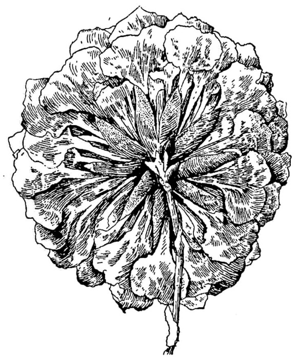 Рис.15. Махровый цветок гвоздики, предназначенный для скрещивания; А – перед подготовкой; В – после подрезки лепестков; видно 7 тычинок (вместо 10 нормальных) и 2 хорошо развитых пестика