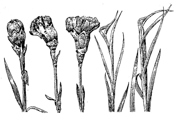 Довольно часто гвоздикам закрытого грунта приходится вступать в противоборство с ржавчинными грибами, возбудителями одной из самых вредоносных болезней – ржавчины. Листья и стебли растений покрываются маленькими подушечками, окруженными ореолом желтоватых пятен. Внутри подушечек сосредоточивается масса спор грибов, которые при созревании прорываются наружу пылящим порошком. Сильное поражение приводит к засыханию листьев, обламыванию стеблей и постепенному угасанию растительной жизни.