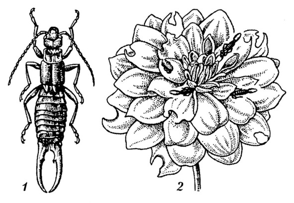 Рис.21. Ущерб, причиняемый георгине уховерткой; 1 – взрослое насекомое; 2 – поврежденный цветок