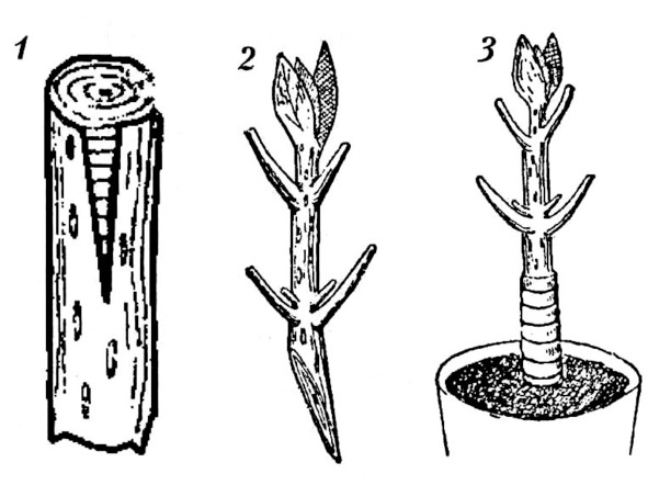 Рис.25. Прививка гортензии способом под кору: 1 – подвой; 2 – черенок; 3 – готовая прививка