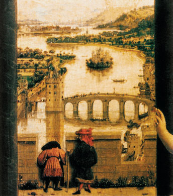 Мост в «Мадонне канцлера Ролена» – это мост Монтеро. Но не надо думать, что Ян ван Эйк был обязан точно воспроизвести его вид. В действительности мост мог неоднократно перестраиваться и меняться при этом до неузнаваемости, картина же должна была навеки сохранить память об искупительном деянии. Контекст подсказывал зрителю, независимо от того, видел ли он мост Монтеро своими глазами или только слышал о нем: вот тот самый мост и вот высокий новый крест на нем, поставленный в память об Иоанне Бесстрашном. Так же и правый берег реки со множеством церквей на нем – не столько изображение Монтеро, сколько собирательный образ всех тех капелл и церквей, которые должны были быть возведены согласно Аррасскому трактату[112].