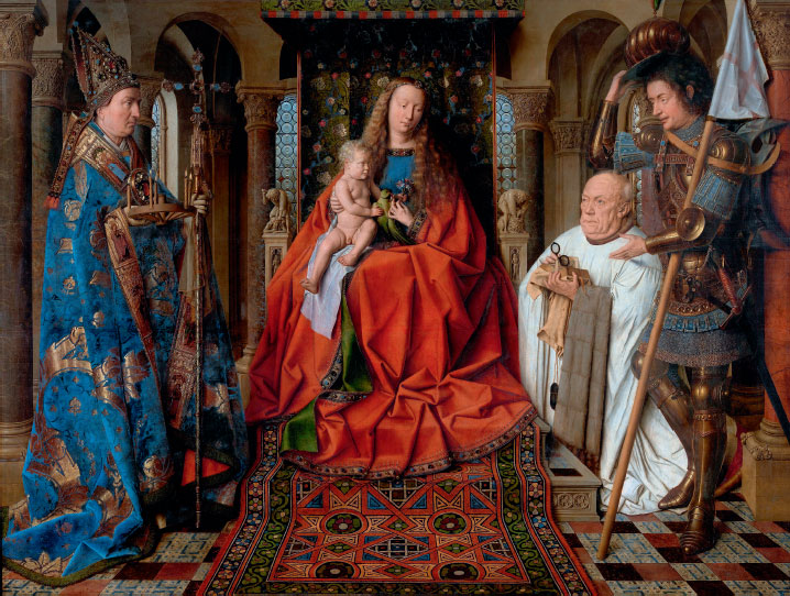 Никола Ролен был советником Иоанна Бесстрашного и свидетелем его убийства. Три года спустя Филипп Добрый назначил его канцлером Бургундии. Жажда отмщения Карлу VII была одним из движителей многолетней политики Ролена. Его «Мадонна» – торжественный финал этой истории. Вот чем вызвана поразительная отрешенность Ролена, Христа и Марии от излучающего благоденствие пейзажа, открывающегося за аркадой дворцовой лоджии.