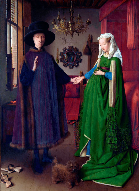Для их земной жизни обет взаимной верности был важнее венчания в церкви. Обряд, который мог совершаться без священника, требовал произнесения женихом и невестой слов торжественного обета, в подтверждение которого жених поднимал руку. «Иоханнес де Эйк был здесь 1434» – начертано на стене комнаты. Стало быть, перед нами не просто первый в истории станковой живописи супружеский портрет, но и свидетельство о браке за подписью художника. Ван Эйка вместе с другим свидетелем можно разглядеть в проеме двери, отраженном в выпуклом зеркале[120].