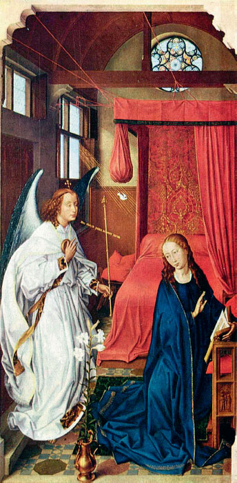 В «Благовещении» на левой створке алтаря архангел Гавриил, кажется, не входит в узкую комнату Марии, а материализуется на наших глазах словно облако, принимающее человеческий облик. Прохладное сияние его одежд, на фоне которого сверкают безупречной белизной лилии Марии, Рогир противопоставил мрачной синеве ее мафория. Широко расстилающиеся складки мафория не позволяют понять, как стоит Мария. Неопределенность (если не сказать – невероятность) ее позы как нельзя лучше выражает смятение, вызванное в ее душе словами, идущими от уст архангела к ее уху: «Радуйся, благодатная!» Лицо Марии отнюдь не освещено радостью, да и Гавриил произносит свое приветствие с улыбкой Будды, не глядя на Марию. Художник постарался изгнать из сцены Благовещения все, что могло бы сблизить ее с обычной встречей двух лиц. Перед нами изображение чуда. Но, следуя традиции нидерландской живописи, Рогир не забыл ни о гвоздях на ставнях, ни о растяжках полога над постелью Марии, ни о занавесе у изголовья кровати, ни о резьбе на пюпитре, которая изображает сцену грехопадения и таким образом напоминает о том, что Марии уготована роль новой Евы, мистической невесты нового Адама – искупителя первородного греха.