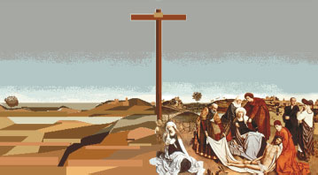 Этим приемом Петрус, во-первых, придал сцене прощания с телом Христа интимный характер: собравшимся хватило места с одной стороны у подножия креста. Во-вторых, сцена приобрела жизненную убедительность: близкие Христа спускаются по склону Голгофы к могиле, вырубленной в скале где-то внизу справа. И в-третьих, показав лишь малую часть креста, Кристус включил в картину необъятное подразумеваемое пространство, которое как минимум вчетверо обширнее изображенного, потому что зритель непроизвольно присоединяет к панораме недостающую половину левее креста и воображает перекладину на очень большой высоте. Крест, благодаря метонимическому приему Кристуса, оказывается воистину вселенским крестом. Оплакивание обретает всемирно-исторический масштаб, что было бы невозможно представить с такой же ясностью никакими иными средствами. Грандиозность креста – этого орудия смерти – подчеркнута соседством его деревянного основания с трогательным деревцем, только что распустившим молодые листочки.