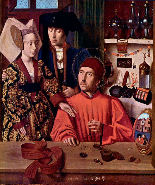 Тогда же Петрус Кристус написал картину «Святой Элигий», которая, возможно, была заказана ему антверпенской корпорацией золотых дел мастеров. Этот святой считался покровителем их ремесла[204].