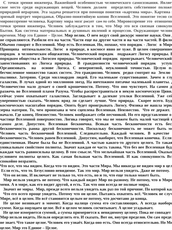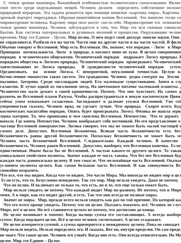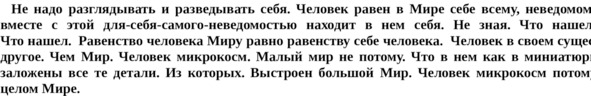 Только в Мире человек находит себя. Видит в Мире себя так. Что узнаёт себя в согласии Мира. Видит себя в Мире. Узнавая раньше всякого знания. Что только Мир ему место. И только Мир равен ему. Загадочная бездонность. Только ей равен человек в своем существе. Только в ней видит своё родное. И только ей, ничему другому и никогда не скажет безусловного «да». И чтобы узнать свое место. Оно в Мире. Не надо обязательно это сознавать. Как родное. Узнается до всякого сознания.