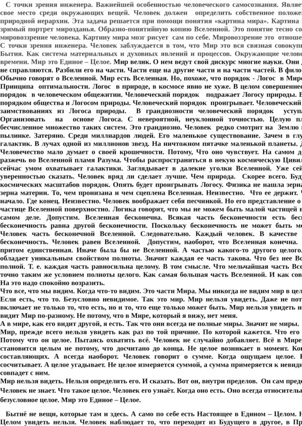 С точки зрения инженера. Человек заблуждается в том, что он может познать Мир. Истина Мира не познаваема. Но это не значит. Что человек не может познать что – либо в Настоящем Мира. Человеческое сознание сконцентрировано вокруг Бытия в затылочной части Мозга Человека. Бытиё человека формируется на основе апперцепции и антиципации. Бытиё отражает Прошлое в Мире. Бытиё занимает центральное место в сознании человека. Бытиё образует смысловую ось и формирует способ мышления человека. Этот способ мышления человека традиционно называется словом «философствование». Это исходное понятие, на базе которого строится философская картина мира для человека. Это самая общая категория философии, носящая предельно абстрактный характер. Бытиё не просто фиксирует существование вещей, человека, идеи, мира в целом. Бытиё не просто обобщает их свойства. Бытие – это реальность, данная в мышлении человека. Бытиё это единство объективной и субъективной реальности. Субъективная мысль человека о Бытие раскрывает содержание Мира для человека непосредственно. С точки зрения инженера. Человек заблуждается в том, что понятие «Мир» обладает двумя основными значениями: