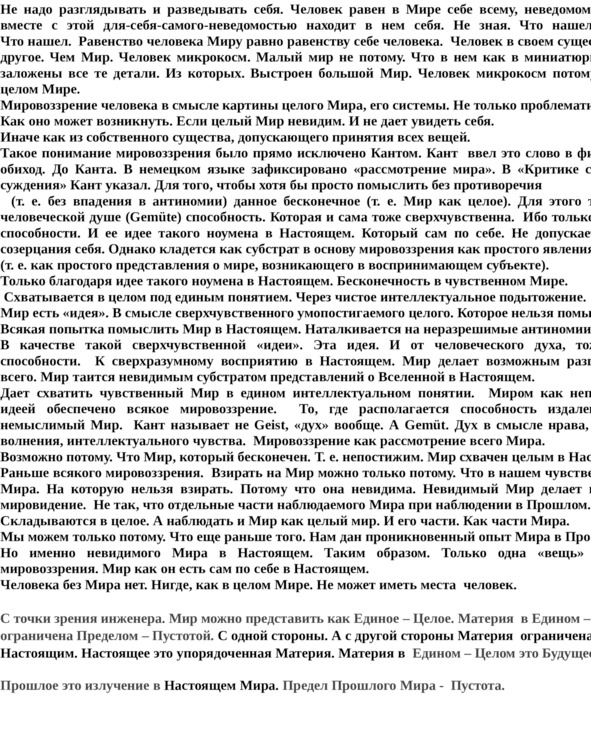 – комплексом человеческих отношений, образующих человечество как Мир в «экзистенциальном» смысле (в его противопоставлении физическому универсуму). МИР вплоть до Канта обозначал весь комплекс творения, противостоящий Богу. МИР – многозначное понятие в научно-философском дискурсе. Наиболее близкими к нему является понятие Бытия. Существующего. И существования, природы, целого, Вселенной, космоса. Кант определял мир как «совокупность всех явлений», выступающую предметом космологии. Но в более абстрактном плане он рассматривал понятие «Мир» как «целокупность синтеза» явлений. Того или иного определенного плана. Сближая его логическое ядро со своим понятием схемы. В этом смысле Мир можно определить как что – то особенное. Всеобщее. Взятым из Бытия сознанием человека. В полноте своей эмпирической развертки. С точки зрения инженера. Целокупность синтеза явлений. Того или иного определенного плана. Как схема. Является Небытиём.