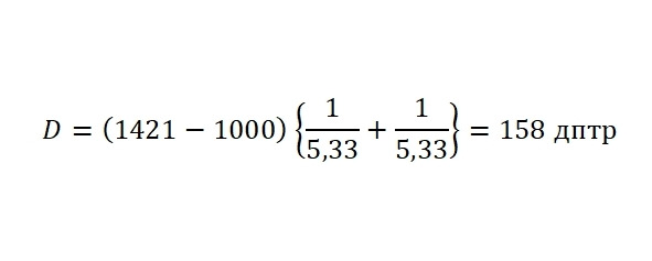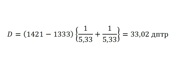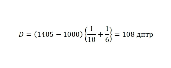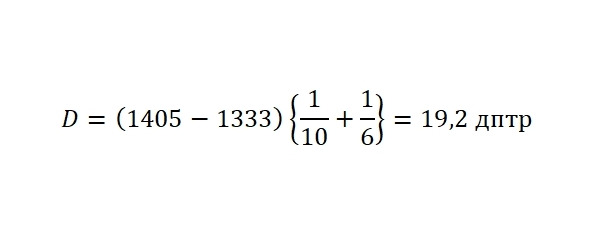 Для расчета оптической силы хрусталика будем использовать формулу тонкой линзы. (В формуле во второй скобке изменен знак с минуса на плюс так как хрусталик представляет собой двояковыпуклую линзу).
