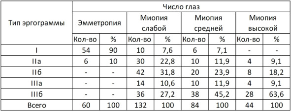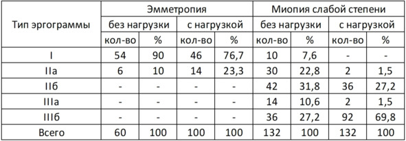Чтобы понять, у кого более выносливая цилиарная мышца у миопа или эмметропа необходимо сравнить только два столбца в данной таблице: процентное соотношение исследуемых глаз эмметропов под нагрузкой и процентное соотношение исследуемых глаз миопов без нагрузки. Тип эргограммы говорит нам о продолжительности работы цилиарной мышцы, при которой текст-объект читается без потери четкости. Потеря четкости изображения будет связана с усталостью цилиарной мышцы. Самый лучший результат соответствует первому типу эркограммы. Согласно данным таблицы мы видим, что эмметропы, использующие минусовую нагрузку, лучше справились с этой задачей, чем миопы без данной нагрузки, но с возможной функциональной миопией. Можно сделать вывод, что цилиарная мышца у эмметропа более выносливая и обладает лучшей работоспособностью, чем у миопа.