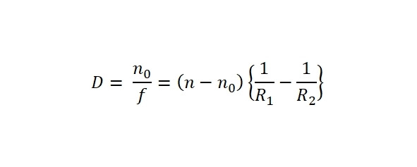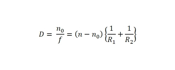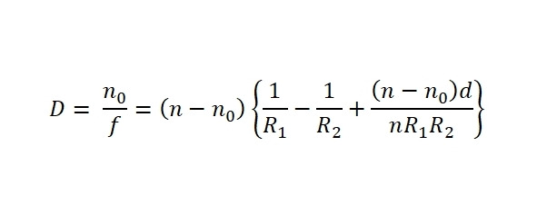 n0 – показатель преломления среды, окружающей линзу, d – толщина линзы, R1 – радиус кривизны поверхности, которая ближе к источнику света (дальше от фокальной плоскости), R2 – радиус кривизны поверхности, которая дальше от источника света (ближе к фокальной плоскости),