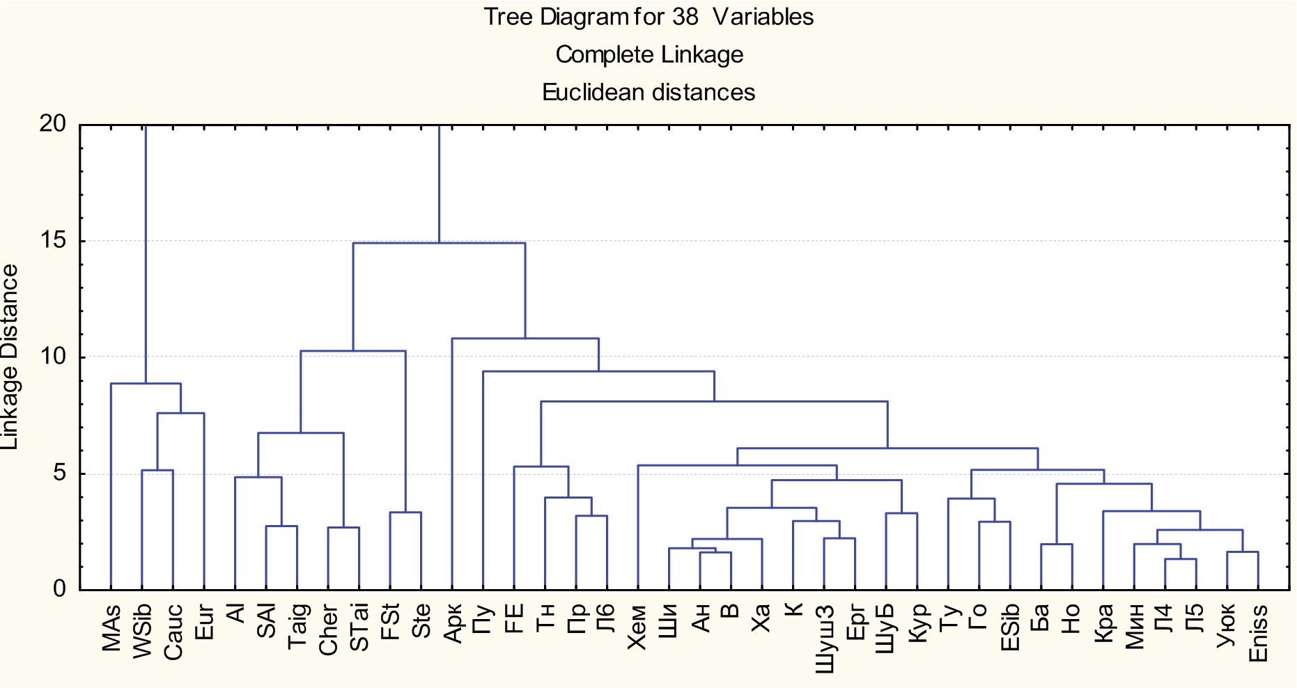 Рис. 5. Дендрограмма сходства (евклидовы расстояния) различных районов и высотных поясов флоры Приенисейских Саян, флористических областей России и сопредельных территорий (Малышев, 1976) по видовому богатству ведущих семейств. Обозначения районов: Eniss – Приенисейские Саяны; ESib – Восточная Сибирь; WSib – Западная Сибирь; MAs – Средняя Азия; Cauc – Кавказ; Eur – Восточная Европа; FE – Дальний Восток; Л6 –центральная часть Восточного Саяна; Кур –Куртушибинский хребет; Хем –Хемчикский хребет; ШуБ – приенисейская правобережная часть Западного Саяна; СШЗ – приенисейская левобережная часть Западного Саяна; Кра – красноярские районы; Ерг –Ергаки и сопредельные территории; Л4 – приенисейская левобережная часть Восточного Саяна; Л5 – приенисейская правобережная часть Восточного Саяна; Мин – Минусинские Саяны; Уюк –Уюкский хребет. Флористические районы Сибири: В – Верхнеенисейский; Ха – Хакасия; Ан – Ангарский; Ши – Шилкинский; К – Кемеровский; Го – Горно-алтайский; Ту – Тува; Но – Новосибирский; Ба – Барнаульский; Пр – Приленско-Катангский; Тн – Тунгусский; Пу – Путоранский. Пояса: Al – альпийский; SAl – субальпийский; Taig – таежный; Cher – черневой; STai – светлохвойно-лесной; FSt – лесостепной; Ste – степной
