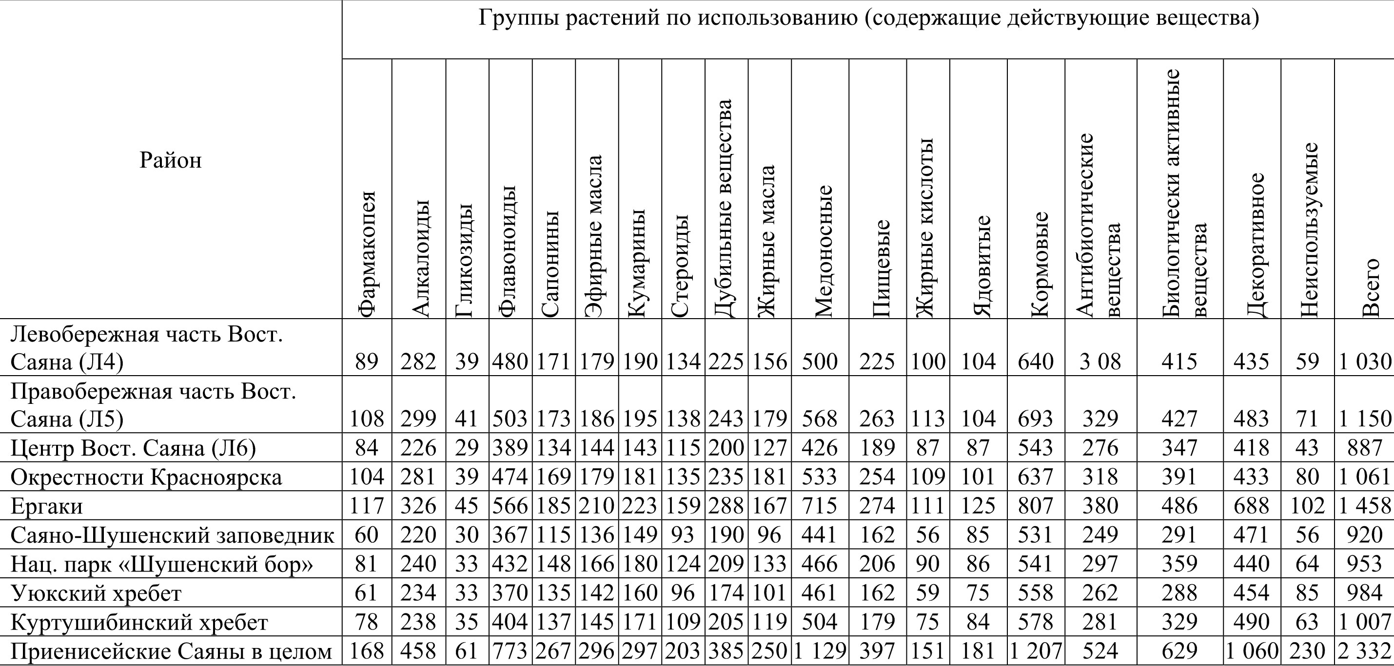 Приенисейские Саяны – уникальный, богатейший регион, который широко вовлечен в хозяйственную деятельность в качестве источника биологических ресурсов, но использование этих ресурсов происходит хаотично, неэффективно, часто с уничтожением или подрывом самого источника конкретного ресурса. При детализации ресурсных данных по флоре ПС в соответствии с опубликованными сведениями (Растительные ресурсы…, 1986; 1987а,б; 1988;1990; 1991; 1993; 1994 и др.) было выделено 18 групп полезных растений (табл. 2). При этом использовалось два ключевых подхода: по характеру использования вида и по содержанию действующих веществ. Количество неиспользуемых и не содержащих ценных веществ (нет данных) видов оказалось очень невелико. Так, в целом по региону количество видов с неизученными полезными свойствами составило 230, что меньше 10 % от общего количества видов.