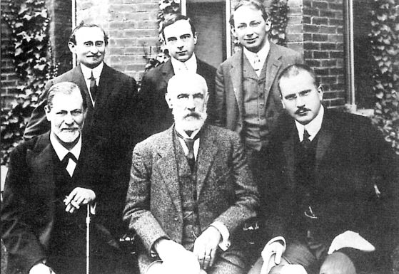 Холл (сидит в центре) с гостями юбилейных торжеств в Университете Кларка (1909). Сидят – З.Фрейд (слева) и К.Г. Юнг (справа); стоят (слева направо) – А. Брилл, Э.Джонс,Ш. Ференци