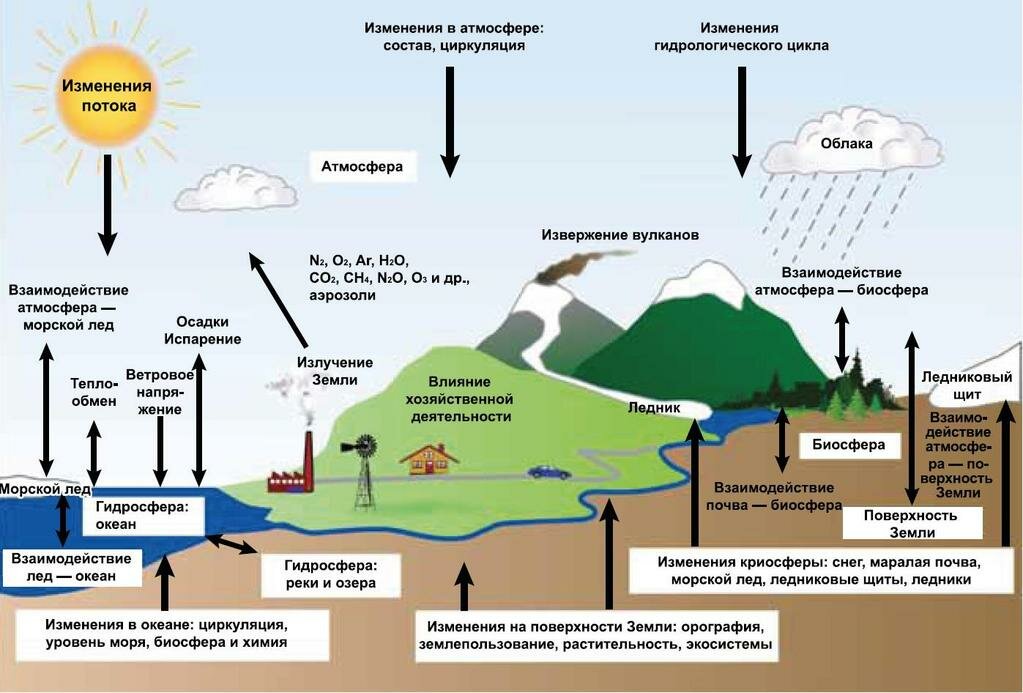 Климатическая система Земли и некоторые влияющие на нее факторы и взаимосвязи представлены на рис. 1.1. Что из всего этого является основной причиной слишком быстрого современного потепления? Встречается множество научных публикаций, где берется какой-то отдельный фактор и приводятся доказательства того, что именно он и является сейчас основной причиной изменений климата. Поскольку факторов много, то и точек зрения, не совпадающих с наиболее общепринятой, встречается множество.