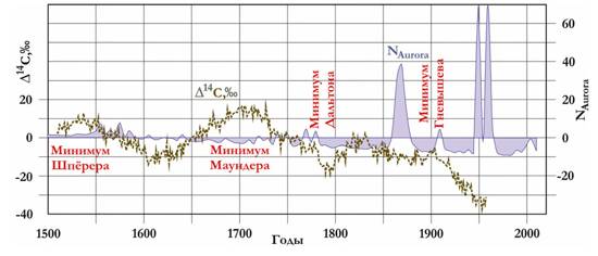 Изменения содержания углерода-14 в атмосфере, определяемые по кольцам деревьев за последние 400 лет, представлены на рис.1.2. Он является одним из природных радиоактивных изотопов. Углерод-14 образуется в верхних слоях тропосферы и стратосфере в результате поглощения атомами азота-14 тепловых нейтронов, которые в свою очередь являются результатом взаимодействия космических лучей и вещества атмосферы. На рис.1.2 хорошо видны эффекты солнечной модуляции, особенно глобальных солнечных минимумов. Для сопоставления приведена нормализованная кривая числа исторических сообщений о наблюдавшихся полярных сияниях