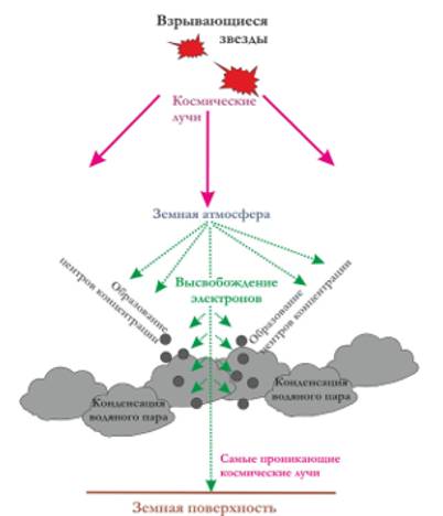 «Заряженные частицы вылетают из взорвавшихся звезд, словно атомные пули, и пробивают земную атмосферу. Редкие изотопы, получающиеся в результате ядерных реакций в верхних слоях атмосферы. в реакциях с азотом, входящим в состав воздуха, образуется радиоактивный углерод, или углерод-14…», Колебания радиоактивного углерода…» свидетельствуют о переменах «…в солнечном настроении…». Проанализировав взаимодействие космических лучей с атмосферой Земли, Свенсмарк и Колдер высказали мысль, что космические лучи напрямую участвуют в преобразованиях климата и регулируют состояние облачного покрова планеты.
