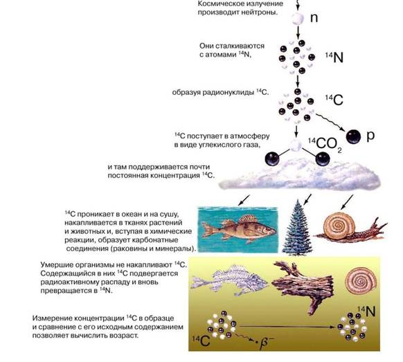 Схема, иллюстрирующая образование радиоуглерода при воздействии космических лучей на атмосферу Земли и его захоронение в органических остатка, представлена на рис. 1.4.