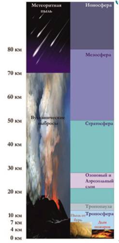 Солнечный экран, мешающий солнечной инсоляции, формируется из метеоритной пыли, вулканических выбросов, которые иногда достигают высоты 70 км, пыльные бури, которые могут поднимать пыль в воздух до 7 км и дым пожаров, представлен на рис.1.5. Эти частицы в совокупности блокируют поток солнечной энергии.