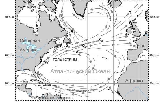 Активное таяние льдов (что мы и наблюдаем в настоящее время) приводит к тому, что огромная масса пресной, холодной, плотной воды уносится Лабрадорским течением (ЛТ), которое также является холодным морским течением. Траектория течения – между побережьем Канады и Гренландией, устремленное в южном направлении из моря Баффина до Ньюфаундлендской банки. У Ньюфаундленда ЛТ смешивается с тёплым струйным течением Гольфстрим (Г), отклоняя его в сторону Европы. Холодные воды подныривают под Г, то есть происходит процесс опреснения и охлаждения стоковым течением. Когда степень опреснения достигает определенного уровня, то плотность вод ЛТ уменьшается, оно поднимается на поверхность и преграждает дорогу Гольфстриму, который значительно влияет на климат Западной Европы. Так, например, в шотландском Глазго средняя температура в январе месяце составляет +3,5 градуса, а в находящейся на той же широте Москве –9,5. Все из-за того, что Глазго находится ближе к “батарее” Гольфстрима. Схема течения Гольфстрима приведена на рис. 1.6.