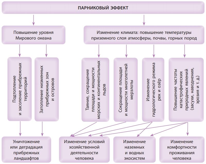 Рис. 1.7. Воздействие парникового эффекта на природные процессы и его геоэкологические последствия