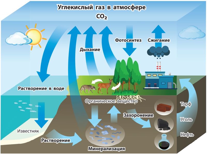 Двуокись углерода (углекислый газ) (СО2). Источниками углекислого газа в атмосфере Земли являются вулканические выбросы, жизнедеятельность биосферы, деятельность человека. Примерно 65% антропогенных выбросов углекислого газа в атмосферу связано со сжиганием ископаемого топлива (нефти, газа, угля и др.) и 35%– с уменьшением его поглощения, вызванного освоением новых земель и массовой вырубкой лесов. При этом примерно 45% от общего количества выбросов углекислого газа остаётся в атмосфере, 30%– поглощается океаном, а остальная часть усваивается биосферой.