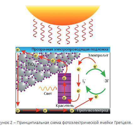 Пластина, на которую нанесён диоксид титана – это анод ячейки. Катодом ячейки является противоположный электрод, который обычно называют противоэлектродом–это токопроводящая подложка другой пластины, на которую в прототипе ячейки был нанесён платиновый подслой– катализатор. Между электродами – токопроводящий электролит (в первоначальном варианте – трийодит в жидкой форме). Принцип работы такого фотоэлемента следующий. Свет проходит через прозрачную подложку и поглощается фотоактивным красителем. Далее эти электроны диффундируют через слой полупроводника к прозрачному проводящему электроду (токоприёмнику) за счет градиента концентрации. Электролит замыкает электрическую цепь и позволяет подходить электронам от катода с платиновым покрытием к полупроводнику, где происходит рекомбинация электронов и «дырок». Таким образом, при достижении порогового значения количества выделяемых электронов образуется электрический ток, который течет от верхнего слоя ячейки к нижнему. Ячейка Гретцеля принципиально отличается от классических фотобатарей на основе кремния. Полупроводник диоксид титана выполняет исключительно роль среды, в которой происходит транспорт (диффузия) фотоэлектронов, генерируемых фотовозбужденным красителем. В кремниевых фотоэлементах полупроводник кремний выполняет двойную функцию – генерирует фотоэлектроны и является средой для транспорта электронов. В ячейке Гретцеля краситель, выступая в роли фотосенсибилизатора (т.е. вещества с увеличенной чувствительностью к воздействию света), играет главенствующую, доминирующую роль, а остальные компоненты –анод из диоксида титана, электролит, катод – играют вспомогательную роль. Работа такой ячейки часто сравнивается с фотосинтезом, поскольку оба процесса используют пигменты и окислительно-восстановительную реакцию, протекающую в электролите.