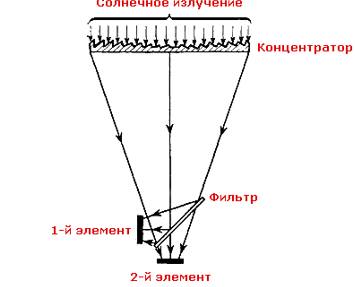 Схема каскадного солнечного элемента, содержащего оптический фильтр, концентратор солнечного излучения и два каскадных элемента, показана на рис. 2.9.