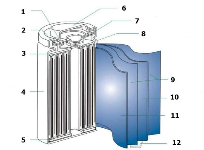 1-предохранитель, 2-прокладка. 3-изолятор, 4–корпус, 5-изолятор, 6-положительный вывод, 7-клапан аварийного сброса давления (не во всех модификациях), 8-токосъемник анода, 9-ионопроводящий сепаратор, пропитанный электролитом, 10-отрицательный электрод, 11-положительный электрод, 12-отрицательный вывод.