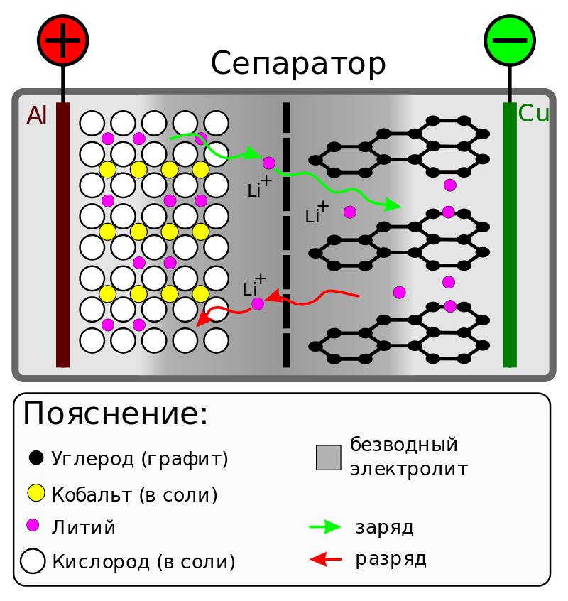 Заряд переносит ион лития, которые может внедряться в кристаллические решетки иных материалов, образовывая химические связи. Если говорить простым языком, то при подаче напряжения на электроды, ионы лития переходят из литиевого катода в угольный, что сопровождается химической реакцией, а при подаче нагрузки (то есть, при зарядке), происходит обратный процесс.