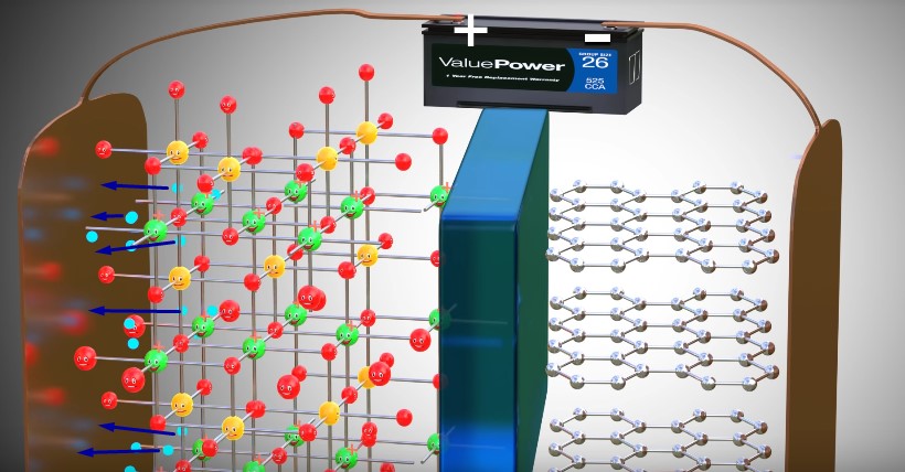 В этот же самый момент положительные ионы лития притягиваются отрицательным полюсом, проходя сквозь электролит и также попадают в графит, размещаясь между его слоями. При этом графит сам по себе не участвует в химических реакциях – он лишь служит «складом» для ионов и электронов лития. Когда все ионы лития достигнут графита и будут «захвачены» его слоями, батарея будет полностью заряжена.