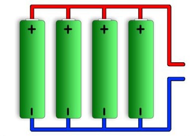 Стандартный элемент выдает напряжение 3,7 – 4,2 В. Для практического использования элементов используют множество их, соединенных последовательно и параллельно, которые образуют батарейный модуль. Если мы хотим увеличить емкость, то отдельные элементы просто соединяем параллельно, рис. 3.7.