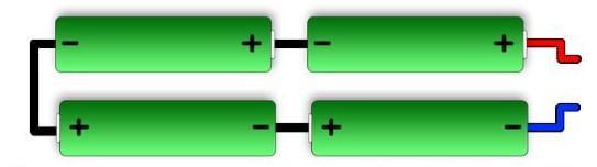 Если нам нужно повысить выходное напряжение, то элементы придется соединить последовательно, рис. 3.8. В этом случае емкость батареи будет равняться емкости самого «слабого» аккумулятора, а выходное напряжение – равняться сумме напряжений на каждом элементе.