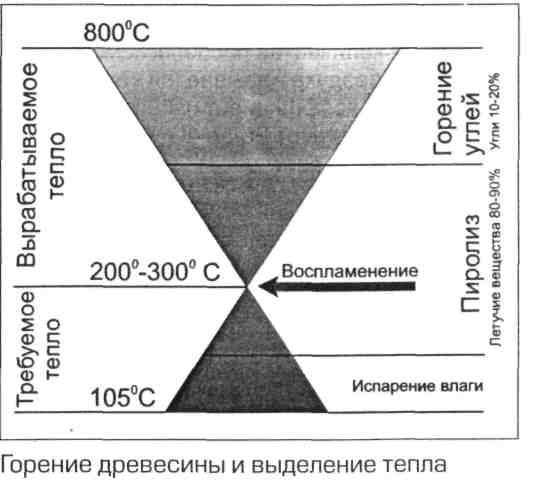 В интервале 200–300ºС происходит воспламенение твердого топлива. Сухая солома воспламеняется при температуре около 200ºС, сухой торф – при температуре 225 – 280ºС , сухая древесина – 220 – 300ºС. При температуре 500 – 600ºС начинается процесс горения летучих компонентов, содержание которых в горючем веществе составляет около 75%. В интервале 800 – 900ºС происходит сгорание твердого углерода и смолы, образующие при этом дымогарные газы дожигаются в камере с подачей воздуха (газогенераторный процесс). При этом дополнительное выделение тепла повышают температуру газов до 1000 – 1100ºС. В полученной газо-воздушной смеси сгорают токсичные образования, тяжелые соединения и частицы сажи.