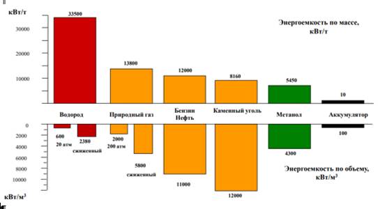 Эффективность водородной энергетики зависит от увеличения плотности и, соответственно, повышения энергоёмкости водорода. На рис.1.2. показана удельная энергоемкость водорода и различных топлив по массе и по объему. Энергосодержание 1 г водорода эквивалентно энергосодержанию около 3 г бензина. При использовании водорода в топливных элементах вследствие высокого КПД топливного элемента (в 1,5–3 раза больше, чем у двигателя внутреннего сгорания) эффективность водорода, как топлива оказывается еще выше (в 4–10 раз).