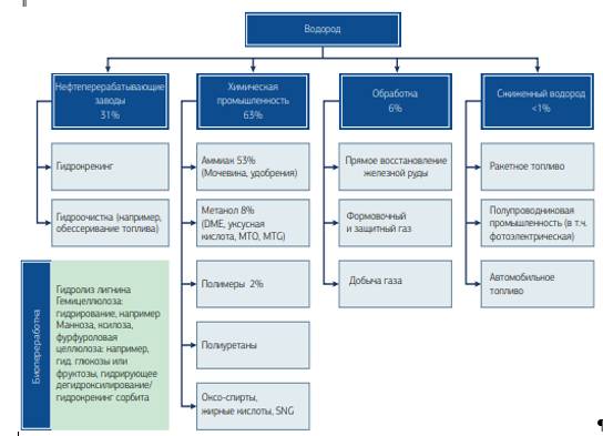 Главные направления использования водорода сегодня – в нефтепереработке и в химической промышленности (для производства различных товаров, в первую очередь – аммиака и метанола), рис. 1.3.