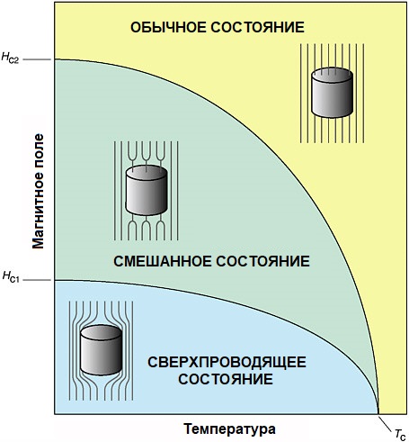 Сверхпроводимостью называется квантовое явление, заключающееся в том, что некоторые материалы при доведении их температуры до определенной критической начинают проявлять нулевое электрическое сопротивление. Перешедший в сверхпроводящее состояние проводник начинает проявлять то, что называется эффектом Мейснера, когда магнитное поле из его объема полностью вытесняется наружу, рис.3.3.