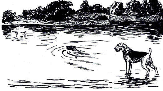 Несколько ударов лапами, и Джери достиг берега. Снукки тоже повернула назад. Но, коснувшись лапами дна, Джери неожиданно обернулся и, стоя по грудь в воде, стал что-то ловить глазами в густой тени омута. Он шумно дышал, бока учащенно вздымались – борьба с водяной стихией была нелегка. Один из косарей, скинув сапоги, тоже всматривался в глубину, готовясь нырнуть.