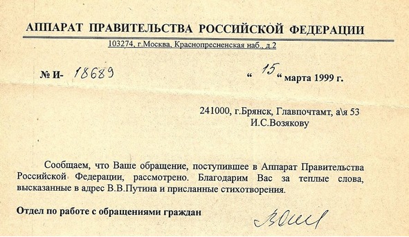 Много лет назад я написал два стихотворения по случаю избрания Владимира Путина Президентом. Не знаю, дошли ли они до места назначения, но от Администрации было благодарственное письмо. Я решил опубликовать эти свои творения для Вас, читатели.