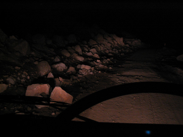душа моя тоже пытается уйти в пятки… топчу педаль тормоза, что есть силы, ныряем вместе с дорогой вниз в крутой съезд (слава богу он был достаточно пологий и широкий) и фары выхватывают указатель «Невер-налево – объезд», кручу руля влево и практически в заносе и с клубами пыли останавливаюсь в повороте… С*ки, не могли знак какой-нибудь поставить, что дорога кончается внезапно. Нервно закуриваю и в путь.