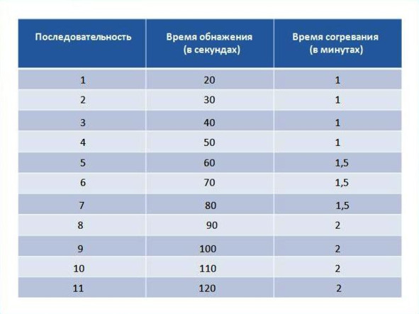 Новичкам: В 1-й день обнажаться следует с 20 секунд, и продолжить до 70 сек, 2-й день – с 20 до 80 сек, 3-й день – с 20 до 90 сек, 4-й день – с 20 до 100 секунд. 5 день – с 20 до 110 секунд. 6 день – с 20 до 120 секунд…