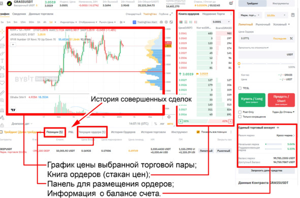 Интерфейс терминала биржи Bybit приведен ниже. В принципе, интерфейсы всех бирж примерно одинаковы.