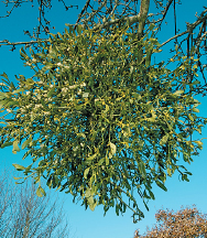 Woody, evergreen parasite with evenly forked branches. Forms large, spherical clumps among branches of host trees, mainly apple (often in cultivation), lime and poplar. FLOWERS Inconspicuous (Feb–Apr). FRUITS White, sticky berries. LEAVES Oval, yellowish green, in opposite pairs. STATUS Widespread but local.
