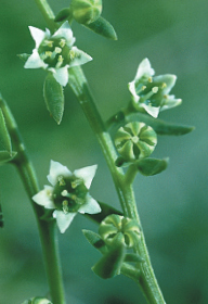 Low-growing plant of chalk grassland with sparse branches and a woody base. FLOWERS Cup-shaped, fused; white inside, yellowish green outside; 4 or 5 pointed lobes create a starlike appearance (June–Aug). FRUITS Greenish, ovoid. LEAVES 5–15mm long, oval, yellowish green. STATUS Extremely local and habitat-specific.