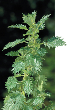 The familiar stinging nettle. FLOWERS Pendulous catkins; borne on separate-sex plants (June–Oct). FRUITS Superficially resembling flowers. LEAVES Oval, with pointed tips, toothed, in opposite pairs; 8cm long and longer than stalks. STATUS Widespread and common, doing best on nitrogen-enriched and disturbed soils.