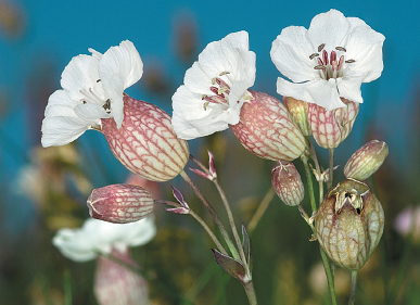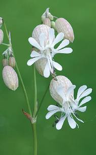 Upright perennial of dry grassland on well-drained soil; often on chalk. FLOWERS White, drooping, 16–18mm across (June–Aug); petals deeply divided; calyx swollen to form a purple-veined bladder. FRUITS Capsules. LEAVES Grey-green, oval; in opposite pairs. STATUS Widespread but common only in the south.