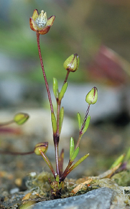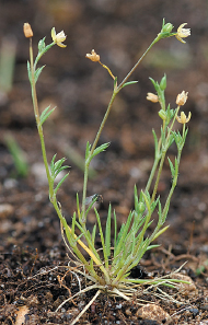 Tiny, upright annual of short, dry grassland, typically on gravelly or sandy soils. FLOWERS White with 4 petals, opening only in bright sunshine (Apr–June). Sepals white-edged and longer than petals. FRUITS Capsules. LEAVES Waxy grey-green, stiff, narrow. STATUS Local in England and Wales only.