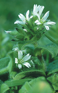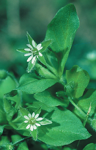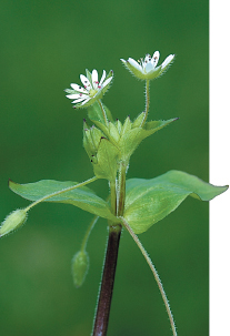 Annual of disturbed ground. Sometimes prostrate. Stems hairy in lines on alternate sides between leaf nodes. FLOWERS White, 5-petalled, 5–10mm across; 3–8 stamens (Jan–Dec). FRUITS Capsules on long, drooping stalks. LEAVES Oval, fresh green and opposite; upper ones unstalked. STATUS Widespread and common.