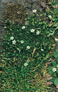 Low annual that is sometimes prostrate. Covered in sticky hairs and found on sandy ground, mainly near the sea. FLOWERS White, 3–6mm across, with 4 notched petals (Apr–July). FRUITS Capsules. LEAVES Ovate, dark green; bracts do not have transparent margins. STATUS Locally common near the coast but scarce inland.